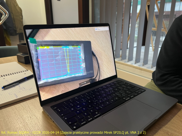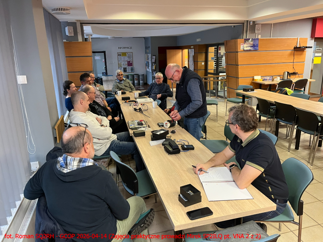 Na spotkaniu w GCOP w dniu 14/04/2026 przyszło 13 osób, zgodnie z zapowiedzią obyły się zajęcia praktyczne, czyli pomiary balunów, rozgałęźników, obciążeń i anten za pomocą analizatora VNA. Zajęcia prowadził kol. Mirosław SP2ILQ.